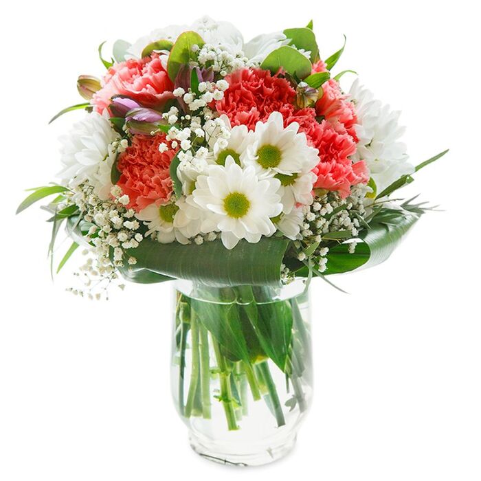 Express your love and appreciation with our timeless flower arrangement. This unique bouquet features a beautiful mix of snow-white chrysanthemums, delicate gypsophila, soft light pink carnations, and vibrant aspidistra leaves.